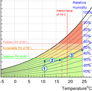 The graph above is colour coded for a typical inside temperature of 19 C and has three humidity levels shown on it, 45% (ideal), 65% (about as high as you can go without problems), and 80% (when problems start getting severe) for basic use. If you want to be more advanced google image search “Carrier psychrometric chart”…