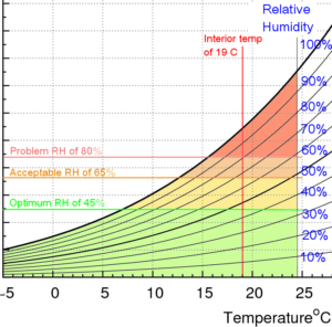 Let’s suppose that that air was at 95% relative humidity at -5 C, how does that change when we heat it? To see this we look along the horizontal axis, and we find that that same air, once heated to 19 C, has a relative humidity of only 20%. To put that in context, the average relative humidity in the Sahara is 25%. Of course this gets added to by people breathing, bathrooms and cooking, but it’s still far drier than the 70%+ relative humidity levels where the problems above start.